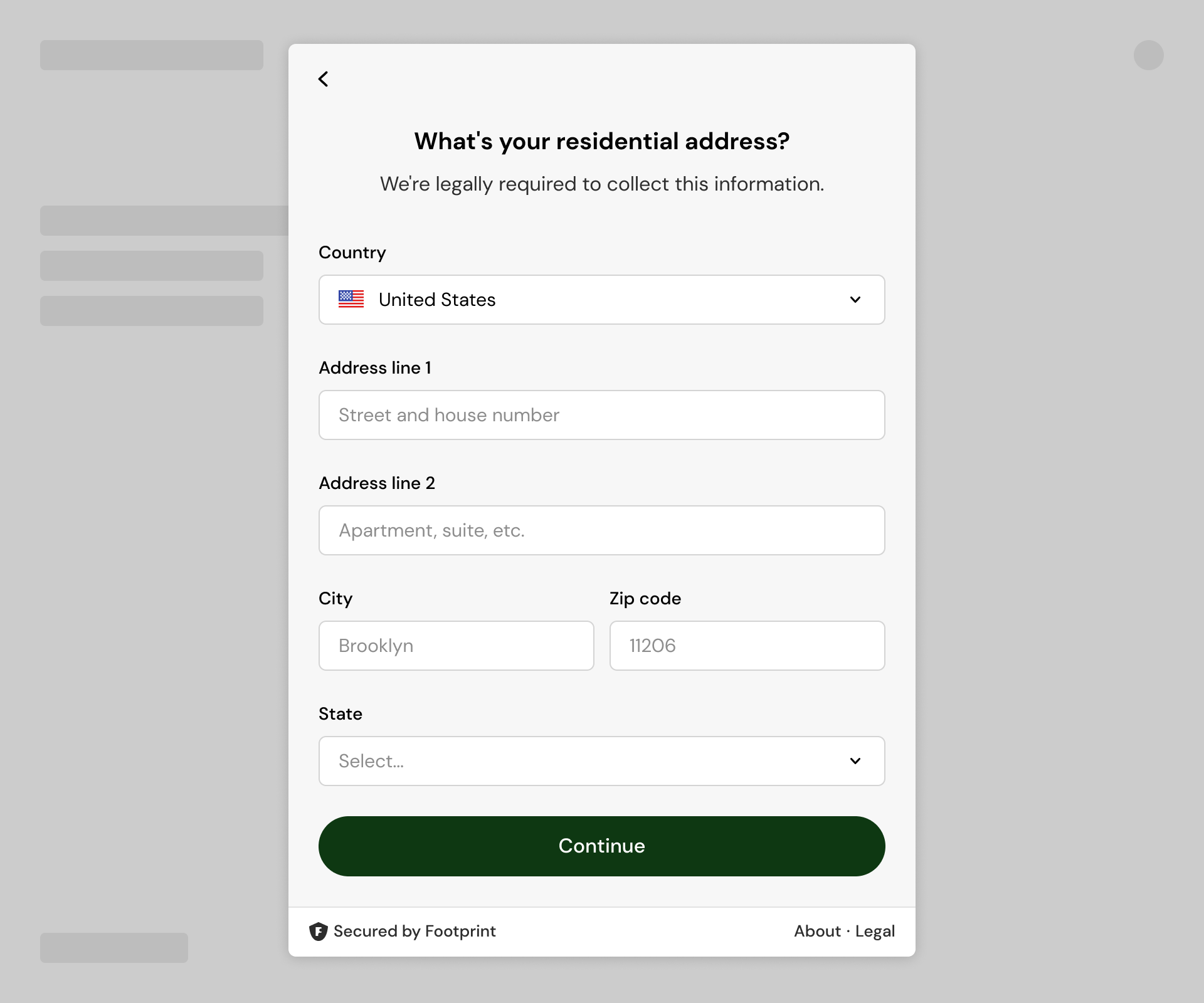 Footprint’s embedded experience does a lot more than meets the eye. Inputs and user behavior are captured and analyzed for fraudulent behavior, form fields like address, SSN, and more are heavily optimized to ensure high-verification accuracy. For instance, we don’t let users enter a P.O. box or warn the user about mistyping of a birth year — all to ensure that while we have the user on screen we get them to provide the most accurate data possible.